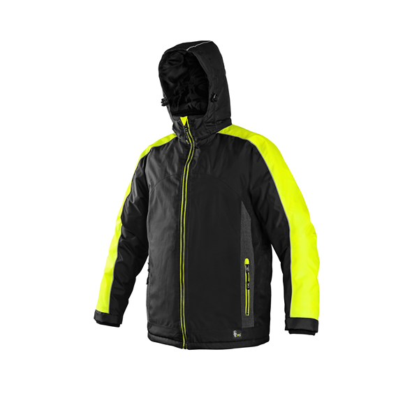 Zateplená bunda, větrání v podpaží, odepínací kapuce, pružná manžeta v rukávu, stahování v dolním kraji, lepené švy, reflexní výpustky, voděodolná. Dvě spodní kapsy na zip, jedna vnitřní kapsa na zip na pravé straně. Zateplená bunda, prodyšná, barva černo-žlutá, vel.S-4XL