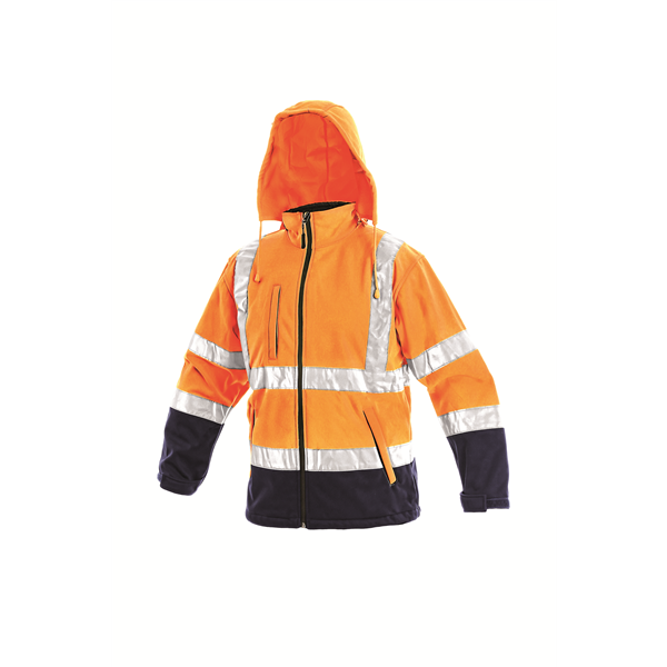 Výstražná, softshell bunda, odolná proti vodě a větru, odepínací kapuce,