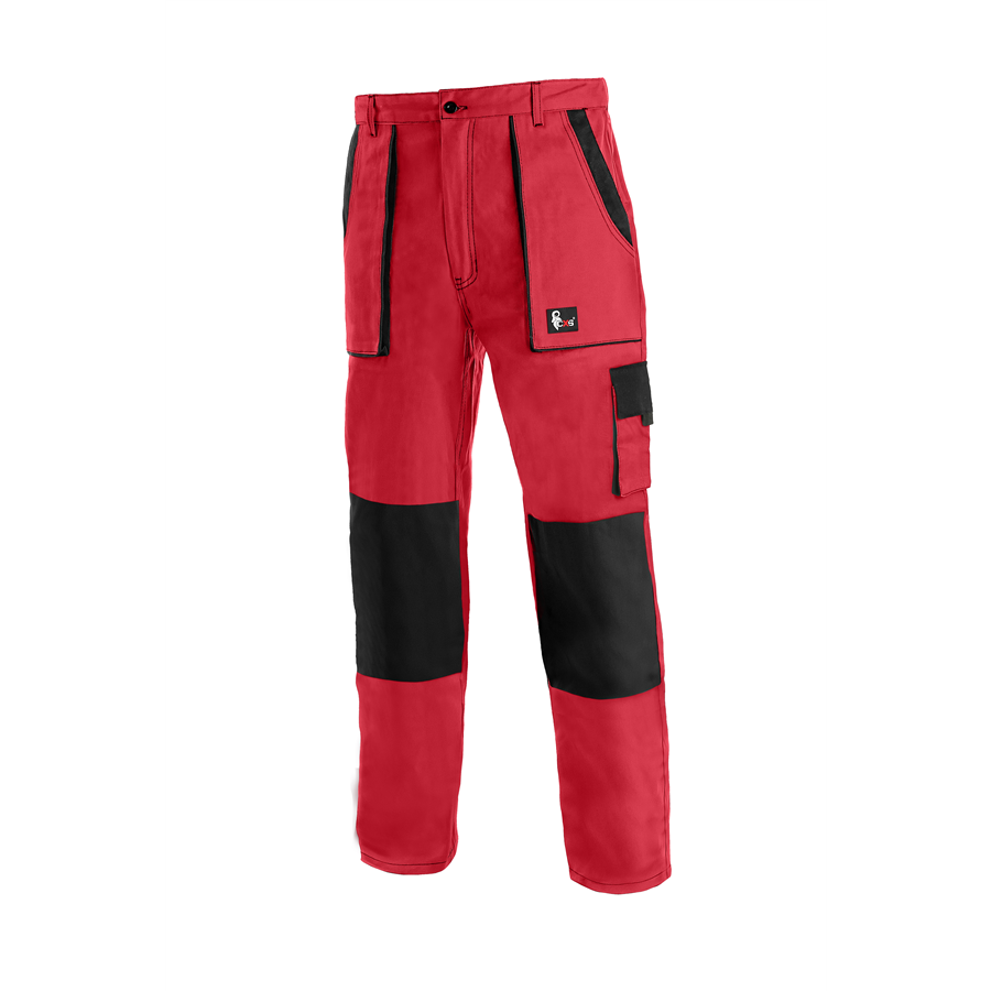 Pánské kalhoty do pasu, zdvojená kolena, pevný pas vzadu do gumy s poutky na opasek, přední našité kapsy, boční kapsy na metr a na mobil. Kalhoty pánské montérkové CXS LUXY do pasu se zdvojenými koleny, červené s černými doplňky, kepr 100% bavlna 260g/m2, vel. 46-68