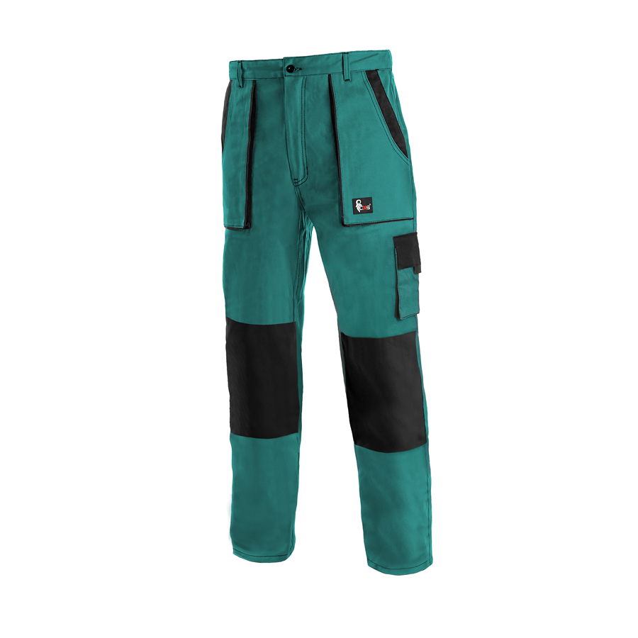 Pánské kalhoty do pasu, zdvojená kolena, pevný pas vzadu do gumy s poutky na opasek, přední našité kapsy, boční kapsy na metr a na mobil. Kalhoty pánské montérkové CXS LUXY do pasu se zdvojenými koleny, zelené s černými doplňky, kepr 100% bavlna 260g/m2, vel. 46-68