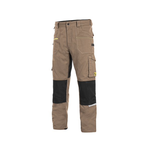 Pánské montérkové kalhoty, strečová tkanina umožňující volný pohyb, pas s poutky na opasek, přední kapsy s kapsou na zip, multifunkční kapsy na obou stranách, kolena zesílena 600D polyesterem s možností vložení kolenních výztuh, dvě zadní kapsy - jedna s klopou, zadní spodní lem nohavice vyztužen 600D polyesterem, reflexní doplňky. Doporučené použití: strojírenství, stavebnictví, lehký průmysl, automobilový průmysl, logistika, skladová manipulace, spedice, autoservisy, údržba, montáže, zemědělství, zahrada, hobby. Kalhoty pánské CXS STRETCH, béžovo-černé, reflexní doplňky, 98% bavlna 2% elastan, 250g/m2, vel. 46-64