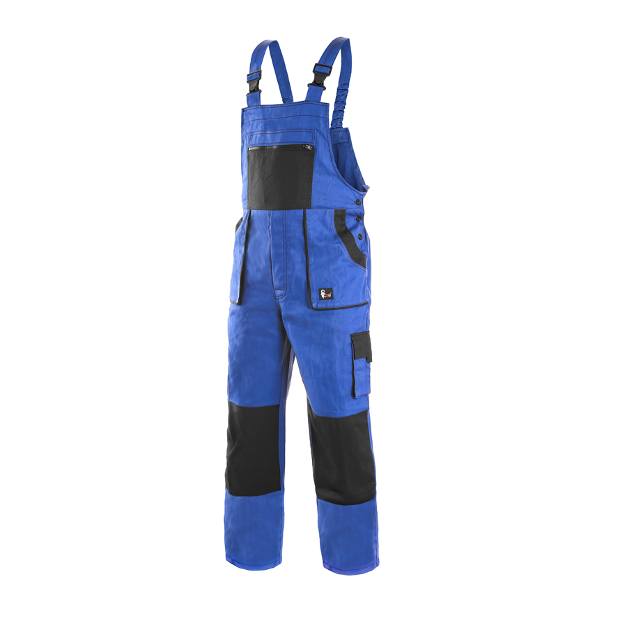 Pánské kalhoty s náprsenkou, zateplené, zdvojená kolena, náprsní kapsa na zip, boční kapsy na metr a na mobil, pas v zadní části do gumy. Kalhoty pánské montérkové CXS LUXY s náprsenkou a zdvojenými koleny, modré s černými doplňky, kepr 100% bavlna 260g/m2, zateplené flanelem, vel. 46 - 66.