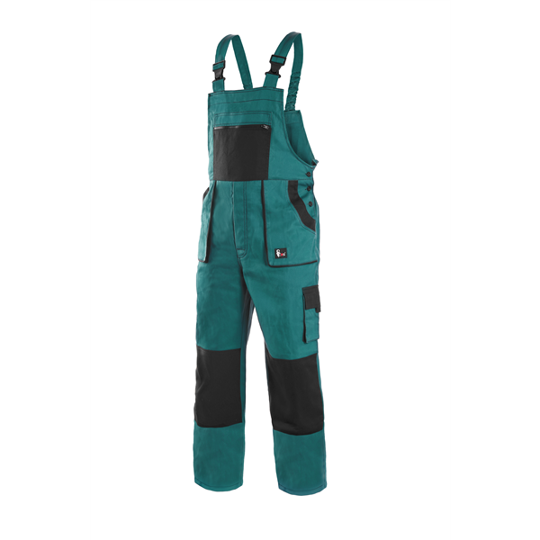 Pánské kalhoty s náprsenkou, zdvojená kolena, přední našité kapsy, náprsní kapsa na zip, boční kapsy na metr a na mobil, pas v zadní části do gumy. Kalhoty pánské montérkové CXS LUXY s náprsenkou a zdvojenými koleny, zelené s černými doplňky, kepr 100% bavlna 260g/m2, vel. 46-68