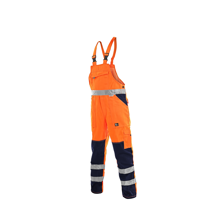 Pánské kalhoty s náprsenkou, výstražné, v zadní části pasu guma na stáhnutí, našitá kapsa na náprsence s kapsou na tužku, přední a zadní našité kapsy, boční kapsa s kapsičkou na mobil, reflexní pruhy 3M. Kalhoty výstražné s náprsenkou, kepr 65% polyester 35% bavlna 280g/m2, reflexní pruhy 3M, oranžovo-modrá, vel. 46-64, EN 20471