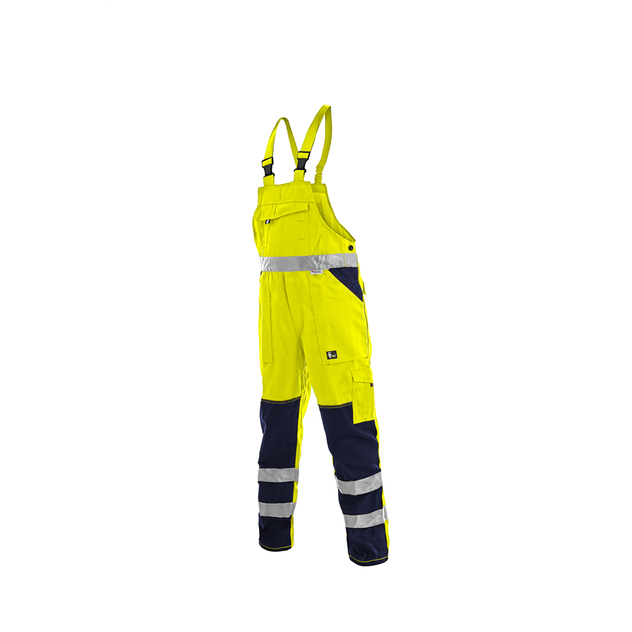 Pánské kalhoty s náprsenkou, výstražné, v zadní části pasu guma na stáhnutí, našitá kapsa na náprsence s kapsou na tužku, přední a zadní našité kapsy, boční kapsa s kapsičkou na mobil, reflexní pruhy 3M. Kalhoty výstražné s náprsenkou, kepr 65% polyester 35% bavlna 280g/m2, reflexní pruhy 3M, žluto-modré, vel. 46-64, EN 20471