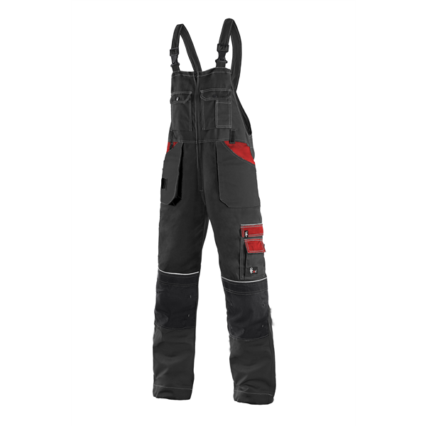 Pánské kalhoty s náprsenkou, zdvojená kolena s možností vložení kolenních výztuh, klínové přední kapsy a našité kapsy na zip s poutky na nářadí, boční multifunkční kapsy, náprsenka s kapsami a rozepínáním uprostřed, reflexní doplňky. Kalhoty pánské s náprsenkou ORION, černo-červené, reflexní doplňky, kepr 60% bavlna 40% polyester 280g/m2,vel.46-64