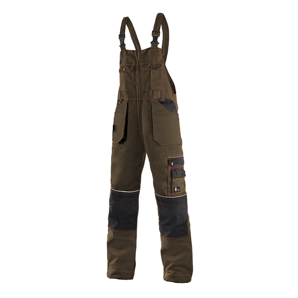 Pánské kalhoty s náprsenkou, zdvojená kolena s možností vložení kolenních výztuh, klínové přední kapsy a našité kapsy na zip s poutky na nářadí, boční multifunkční kapsy, náprsenka s kapsami a rozepínáním uprostřed, reflexní doplňky. Kalhoty pánské s náprsenkou ORION hnědo-černé, reflexní doplňky, : kepr 60% bavlna 40% polyester 280g/m2,vel.46-64