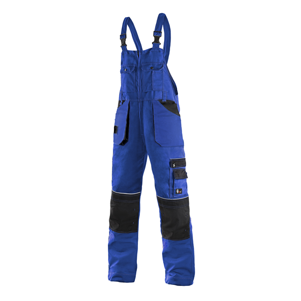Pánské kalhoty s náprsenkou, náprsní kapsy s klopami, pas s poutky na opasek, vzadu do gumy, přední kapsy s poutky na nářadí, multifunkční kapsy na obou stranách, kolena zesílena 600D polyesterem s možností vložení kolenních výztuh, dvě zadní kapsy, jedna na suché zipy, šle s gumou vzadu, reflexní doplňky. Kalhoty pánské s náprsenkou ORION, modro-černé, reflexní doplňky, kepr 60% bavlna 40% polyester 280g/m2,vel.46-64