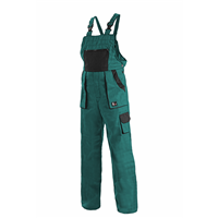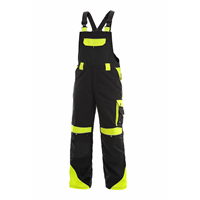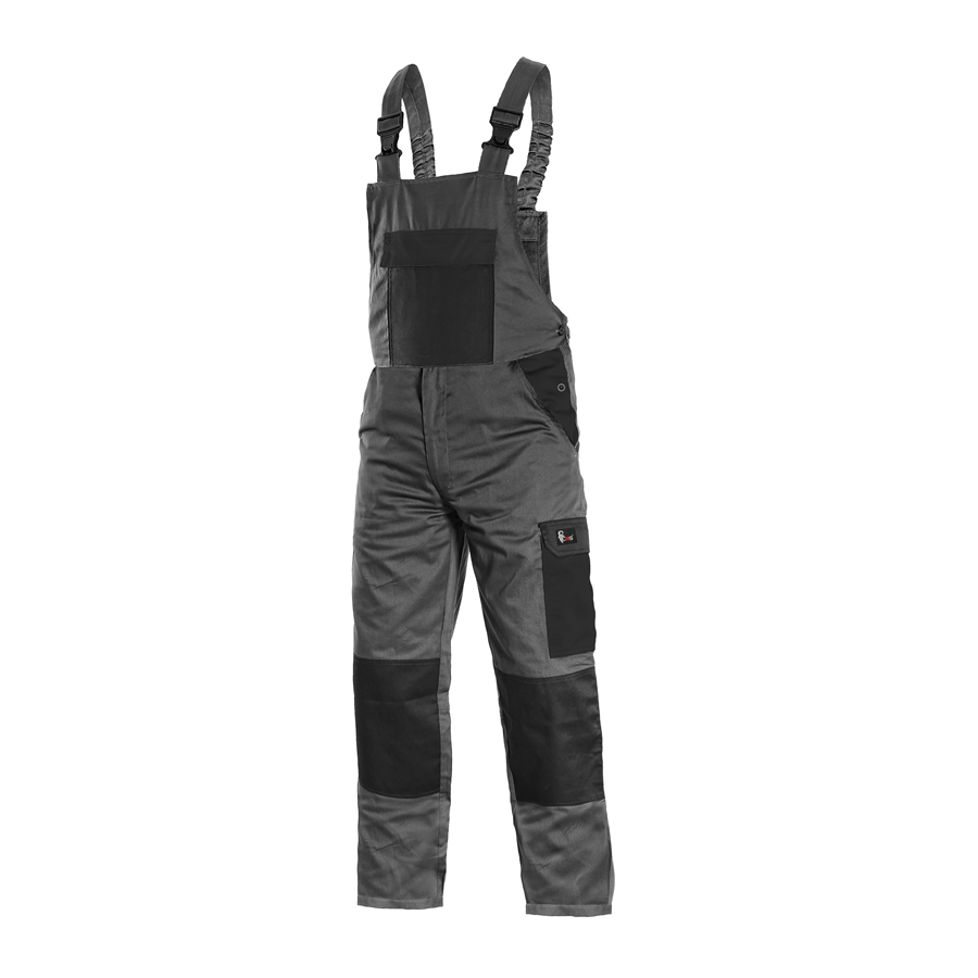 Pánské montérkové kalhoty s náprsenkou, náprsní kapsa s klopou, přední klínové kapsy, kapsa na skládací/svinovací metr, boční kapsa s klopou, zadní jednoduchá kapsa, zdvojená kolena, šle vzadu do gumy. Kalhoty s náprsenkou pánské PHOENIX, šedo-černé, 65% polyester 35% bavlna 190g/m2, vel. 46 - 64