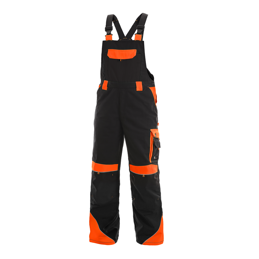 Pánské zahradníky, zesílená kolena s možností vložení kolenních výztuh, pevný pas s poutky na opasek, přední klínové kapsy, zadní kapsy s klopami, boční multifunkční kapsy, náprsenka s kapsou, reflexní doplňky. Kalhoty pánské SIRIUS BRIGHTON s náprsenkou, černo-oranžové, reflexní doplňky, 65% polyester 35% bavlna 270g/m2, vel. 46 - 64