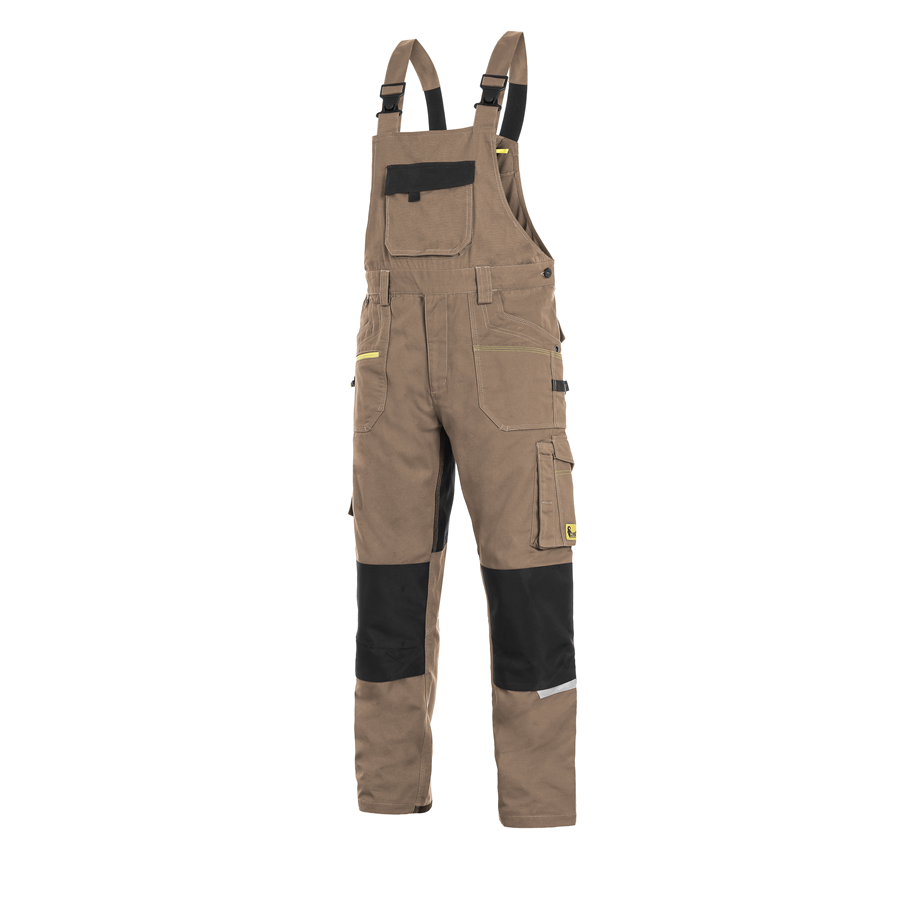Pánské montérkové kalhoty s náprsenkou, strečová tkanina umožňující volný pohyb, náprsní kapsa s klopou, pas s poutky na opasek, přední kapsy s kapsou na zip, multifunkční kapsy na obou stranách, kolena zesílena 600D polyesterem s možností vložení kolenních výztuh, dvě zadní kapy - jedna s klopou, zadní spodní lem nohavice vyztužen 600D polyesterem, šle s gumou vzadu, reflexní doplňky. Doporučené použití: strojírenství, stavebnictví, lehký průmysl, automobilový průmysl, logistika, skladová manipulace, spedice, autoservisy, údržba, montáže, zemědělství, zahrada, hobby. Kalhoty s náprsenkou pánské CXS STRETCH, béžovo-černé, reflexní doplňky, 98% bavlna 2% elastan, 250g/m2, vel. 46-64
