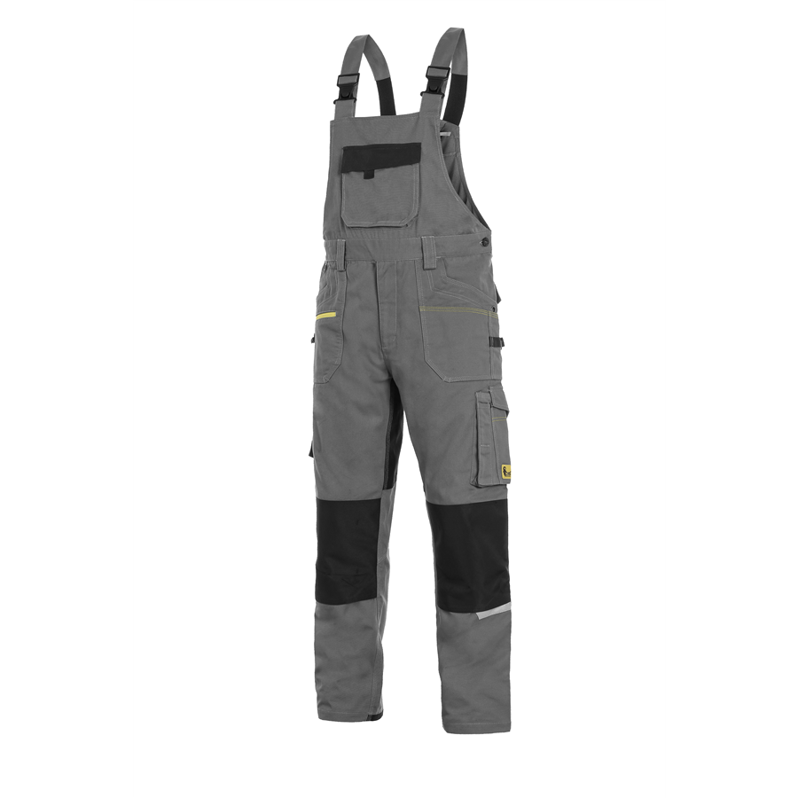 Pánské montérkové kalhoty s náprsenkou, strečová tkanina umožňující volný pohyb, náprsní kapsa s klopou, pas s poutky na opasek, přední kapsy s kapsou na zip, multifunkční kapsy na obou stranách, kolena zesílena 600D polyesterem s možností vložení kolenních výztuh, dvě zadní kapy - jedna s klopou, zadní spodní lem nohavice vyztužen 600D polyesterem, šle s gumou vzadu, reflexní doplňky. Doporučené použití: strojírenství, stavebnictví, lehký průmysl, automobilový průmysl, logistika, skladová manipulace, spedice, autoservisy, údržba, montáže, zemědělství, zahrada, hobby. Kalhoty s náprsenkou pánské CXS STRETCH, šedo-černé, reflexní doplňky, 98% bavlna 2% elastan, 250g/m2, vel. 46-64
