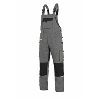 Pánské montérkové kalhoty s náprsenkou, strečová tkanina umožňující volný pohyb, náprsní kapsa s klopou, pas s poutky na opasek, přední kapsy s kapsou na zip, multifunkční kapsy na obou stranách, kolena zesílena 600D polyesterem s možností vložení kolenních výztuh, dvě zadní kapy - jedna s klopou, zadní spodní lem nohavice vyztužen 600D polyesterem, šle s gumou vzadu, reflexní doplňky. Doporučené použití: strojírenství, stavebnictví, lehký průmysl, automobilový průmysl, logistika, skladová manipulace, spedice, autoservisy, údržba, montáže, zemědělství, zahrada, hobby. Kalhoty s náprsenkou pánské CXS STRETCH, šedo-černé, reflexní doplňky, 98% bavlna 2% elastan, 250g/m2, vel. 46-64