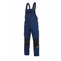 Pánské montérkové kalhoty s náprsenkou, strečová tkanina umožňující volný pohyb, náprsní kapsa s klopou, pas s poutky na opasek, přední kapsy s kapsou na zip, multifunkční kapsy na obou stranách, kolena zesílena 600D polyesterem s možností vložení kolenních výztuh, dvě zadní kapy - jedna s klopou, zadní spodní lem nohavice vyztužen 600D polyesterem, šle s gumou vzadu, reflexní doplňky. Doporučené použití: strojírenství, stavebnictví, lehký průmysl, automobilový průmysl, logistika, skladová manipulace, spedice, autoservisy, údržba, montáže, zemědělství, zahrada, hobby. Kalhoty s náprsenkou pánské CXS STRETCH, tmavě modré-černé, reflexní doplňky, 98% bavlna 2% elastan, 250g/m2, vel. 46-64