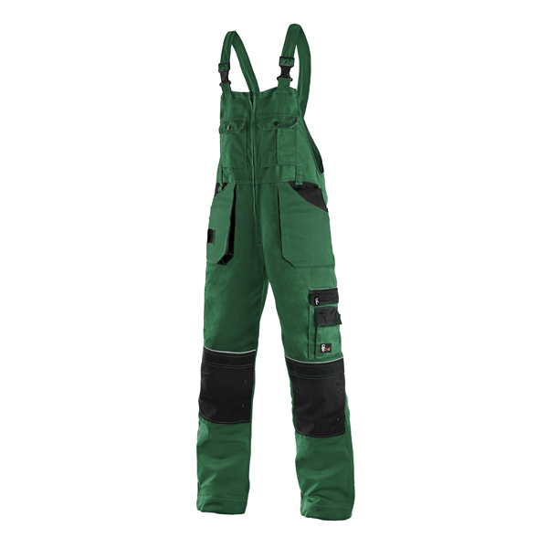 Pánské kalhoty s náprsenkou, zdvojená kolena s možností vložení kolenních výztuh, klínové přední kapsy a našité kapsy na zip s poutky na nářadí, boční multifunkční kapsy, náprsenka s kapsami a rozepínáním uprostřed, reflexní doplňky. Kalhoty pánské s náprsenkou ORION, zeleno-černé, reflexní doplňky, kepr 60% bavlna 40% polyester 280g/m2,vel.46-64