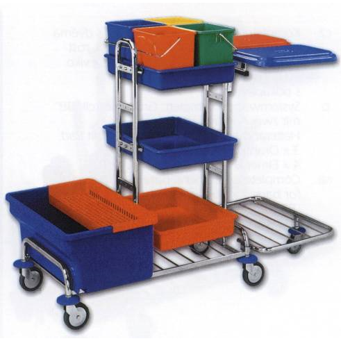 Kompletní vozík: podvozek BB se dvěma bočními držáky, 3x vanička BB s držákem, držák pytle 2x70L, 2x víko 70L, rošt s kolečkem, 4x kbelík 6L, DESI vana 35L s odkapávačem.