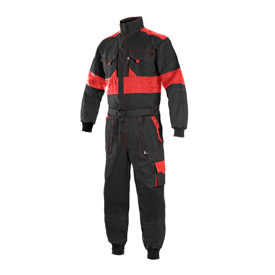 Pánská kombinéza, zdvojená kolena, kryté zapínání, pruženka v bederní části, náprsní kapsy, boční kapsa na metr, nohavice a rukávy do manžety. Kombinéza CXS LUXY se zdvojenými koleny, černá s červenými doplňky, kepr 100% bavlna 260g/m2, vel. 48-64