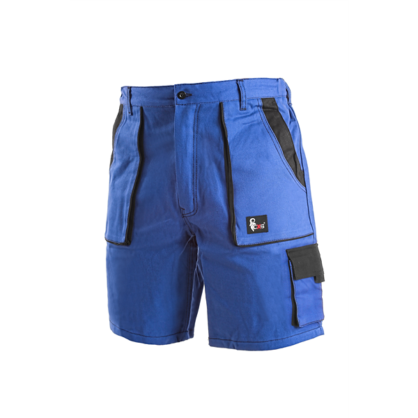 Pánské kraťasy, pevný pas vzadu do gumy s poutky na opasek, přední vakové kapsy, boční kapsy na metr a na mobil. Kraťasy CXS LUXY, pánské do pasu, modré s černými doplňky, kepr - 100% bavlna, 260m2, vel. 46-64