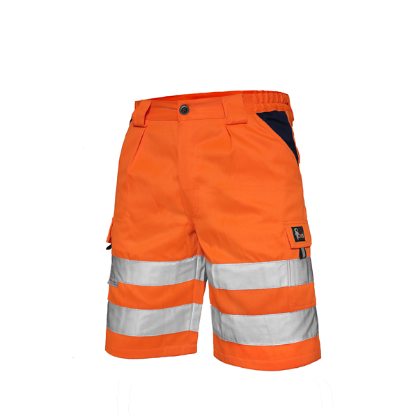 Pánské výstražné kraťasy, pas s poutky na opasek a gumou v bocích, přední klínové kapsy, zadní kapsy s klopou na suchý zip, boční kapsy s klopou na suchý zip, levá boční kapsa rozdělena na dvě komory, reflexní pruhy 3M.