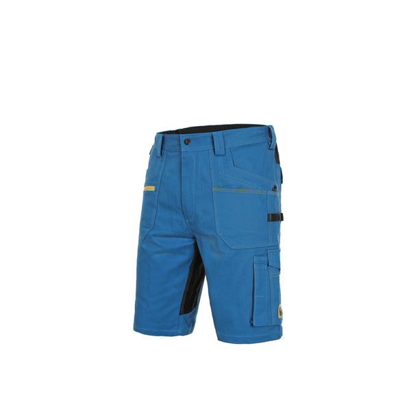 Pánské montérkové kraťasy, strečová tkanina umožňující volný pohyb, pas s poutky na opasek, přední kapsy s kapsou na zip, multifunkční kapsy na obou stranách, dvě zadní kapsy - jedna s klopou. Doporučené použití: letní pracovní oděv, strojírenství, stavebnictví, lehký průmysl, automobilový průmysl, logistika, skladová manipulace, spedice, autoservisy, údržba, montáže, zemědělství, zahrada, hobby. Kraťasy pánské CXS STRETCH, středně modré-černé, 98% bavlna 2% elastan, 250g/m2, vel. 46-64