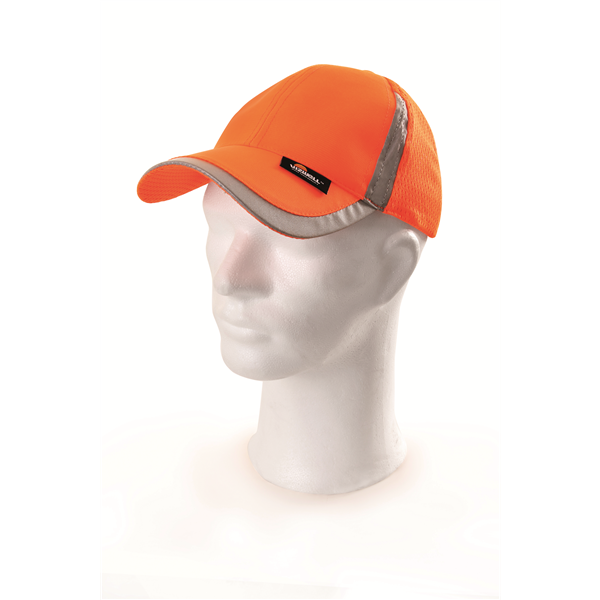 Čepice s kšiltem a s reflexními proužky, šestipanelová, zapínání na suchý zip, zadní díl ze síťoviny. Čepice s kšiltem a reflexními proužky, šestipanelová, zapínání na suchý zip, síťovaná zadní část, barva oranžová, žlutá