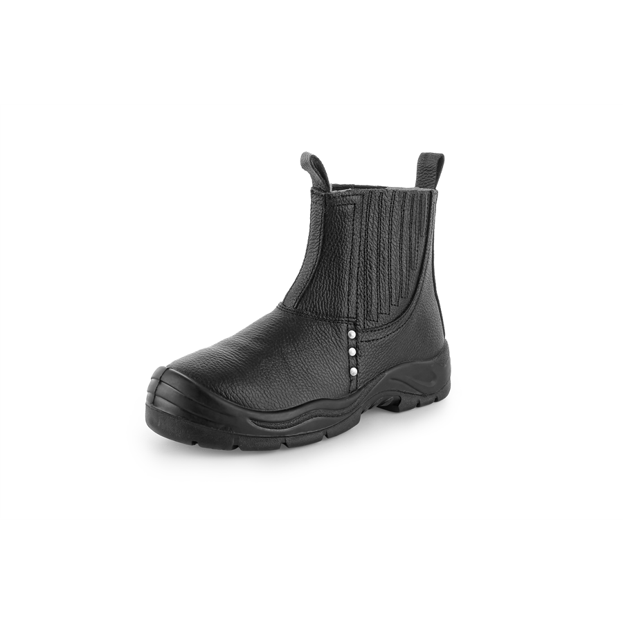 Kotníková obuv s krytou pružinkou, celokožená, materiál: svršek z kvalitní, hrubé tištěné kůže s ocelovou špicí, krytá pružinka z pružné gumy, PU-guma, antistatická, olejivzdorná, protiskluzová podešev, odolná vůči kontaktnímu teplu do 300 °C. Obuv kotníková DRAGO S1, celokožená s krytou pružinkou, tepluvzrodná podešev do 300°C, vel. č. 39 - 48