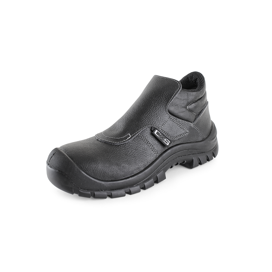 Kotníková obuv, celokožená s ocelovou špicí a planžetou. Obuv, kotníková, kožená s ocelovou špicí a planžetou S3, zapínání na suchý zip, antistatická, olejivzdorná, odolná vůči kontaktnímu teplu do 300 °C, protiskluzová podešev, vel.č. 39-48
