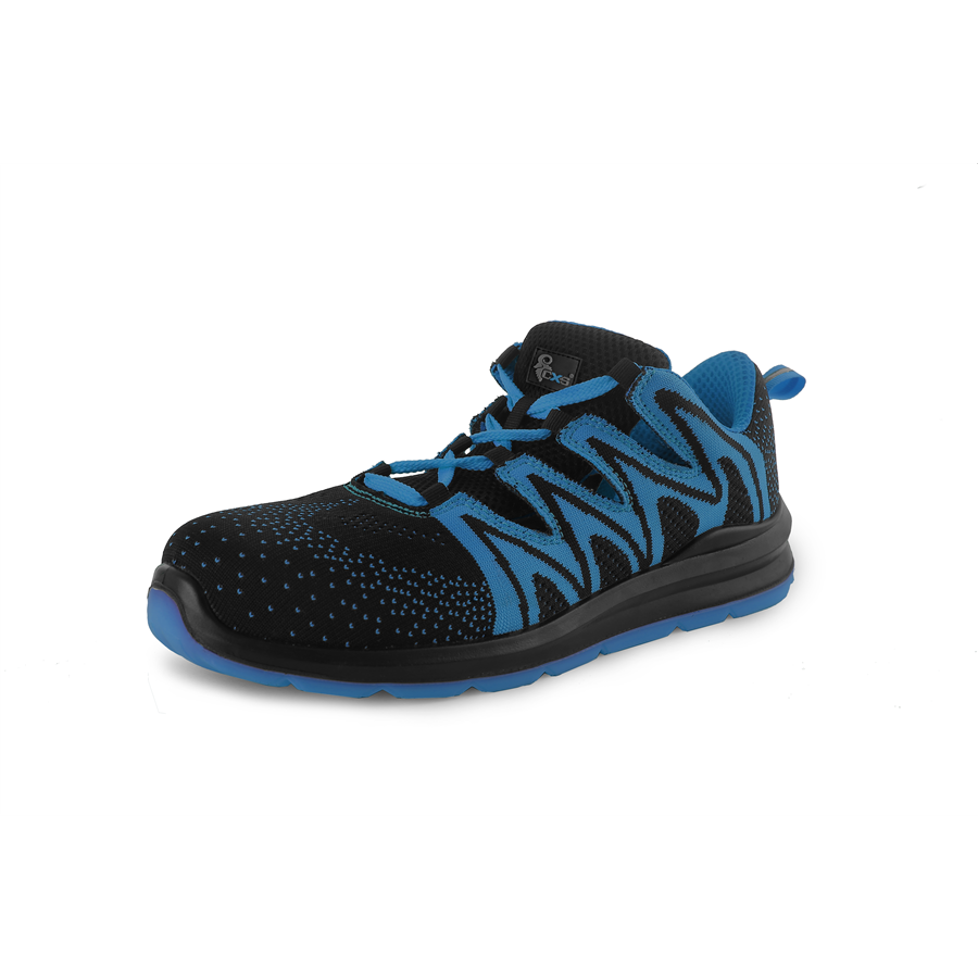 Polobotka, perforovaná s laminátovou špicí a kevlarovou stélkou. Materiál: svršek z odolného 1,5mm polyesteru, 3-vrstvá prodyšná textilní podšívka, PU-PU, protiskluzová, olejivzdorná, antistatická podešev. Obuv polobotka, pracovni, perforovaná, textilní s laminátovou špicí a kevlarovou planžetou, svršek z odolného 1,5mm polyesteru, barva černá/modrá, PU-PU, S1P SRC podešev vel.č. 34-50