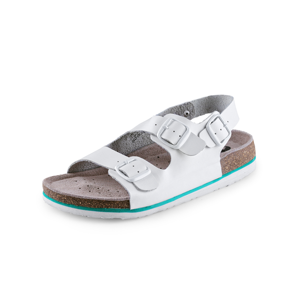 Sandál, dámský, celokožený s dvěma nártními pásky a páskem kolem paty, podešev na klínku. Obuv korkový sandá dámský, kožený se zdravotní anatomickou stélkou, se dvěma nártními pásky a páskem kolem paty, barva bílá, vel. 35-41