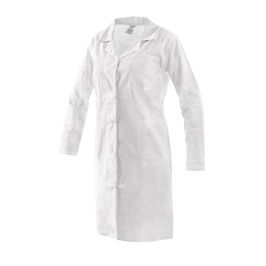 Dámský plášť s dlouhým rukávem, 3 kapsy, vzadu volný pásek s knoflíkem na stáhnutí. Plášť dámský bílý s dlouhým rukávem, kepr 100% bavlna 190g/m2, vel. 38-64