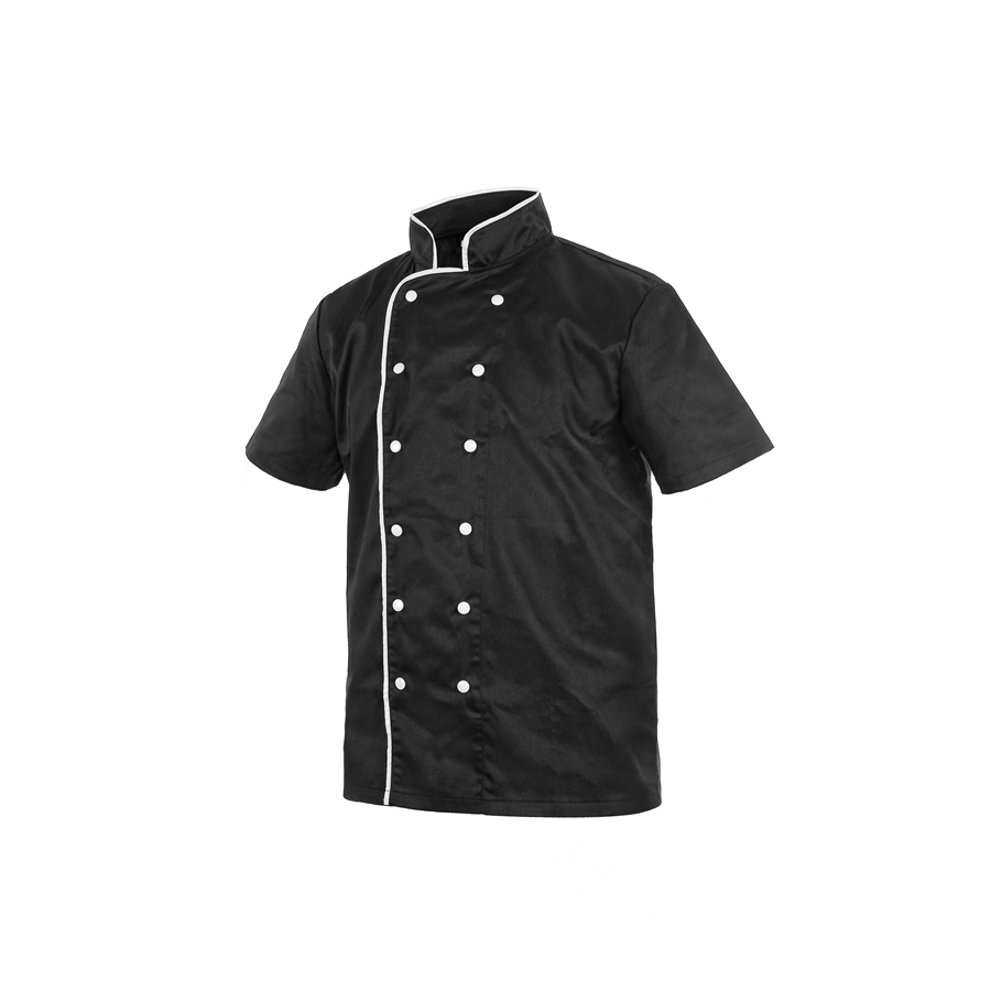 Kuchařský rondon v moderním designu, s krátkým rukávem a stojákem, dvouřadé zapínání na druky. Vhodné pro výšivku a potisk. Doporučené použití: kuchaři, učni. Rondon CHEF s krátkým rukávem, pánský, če...