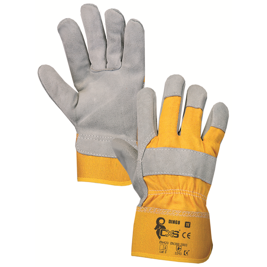 zemědělství. Rukavice z kvalitní šedé hovězí štípenky na dlani, hřbet v kombinaci kůže se žlutou tkaninou, tuhá manžeta s podšívkou ve dlani, vel. 11"