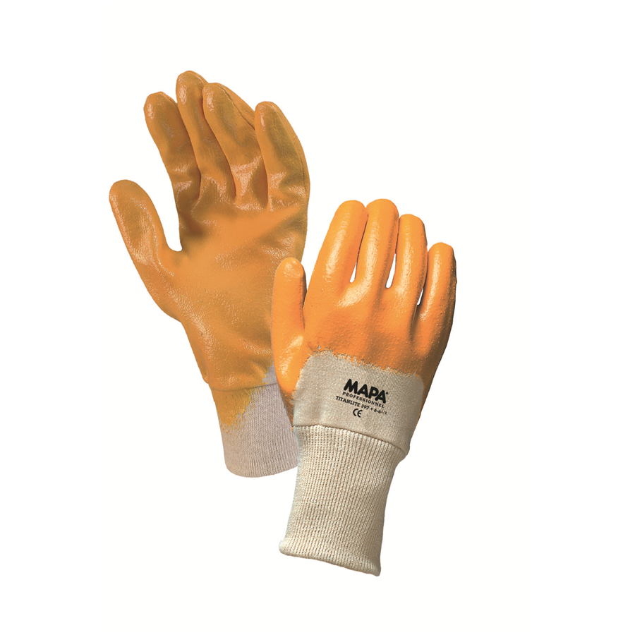 Rukavice máčené v nitrilu s úpletovou manžetou. Délka rukavice: 27-31 cm, tloušťka: 1,00 mm. Doporučené použití: pískování, přesná strojní práce. Odvětví: automobilový/strojírenský průmysl. Rukavice pětiprsté bavlněné s pružným nápletem, polomáčené ve žlutém nitrilu, délka 24cm, vel. 06,07