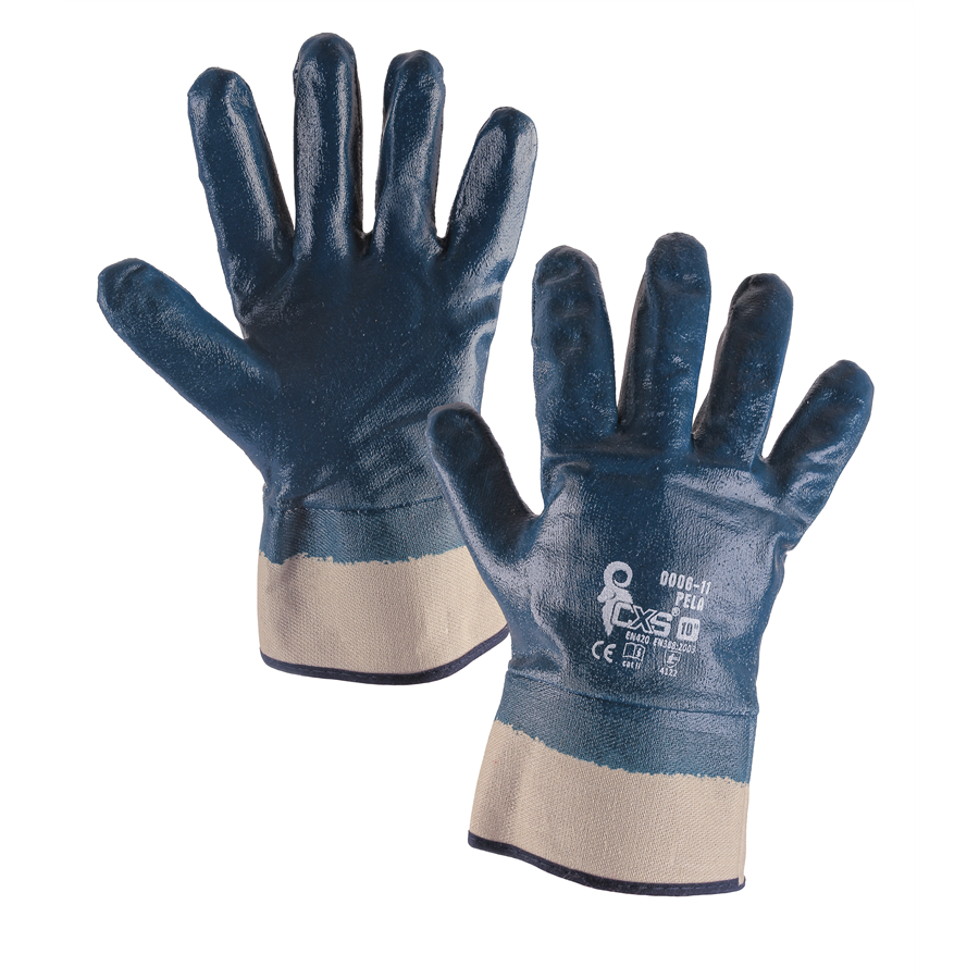 Rukavice máčené v nitrilu s pevnou manžetou. Doporučené použití: olejnaté prostředí, práce s PHM. Odvětví: strojírenství, zemědělství, čerpací stanice. Rukavice bavlněné s manžetou z tuhé plachtoviny, celomáčené v modrém nitrilu,vel. 10"