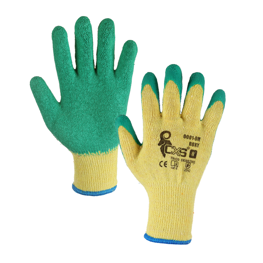Pletené rukavice povrstvené latexem. Doporučené použití: manipulace se zbožím, pomocné práce na staveništi. Odvětví: skladování a logistika, lehký průmysl, stavebnictví. Rukavice ROXY, polomáčené v latexu, vel. 7", 8", 10", 11"