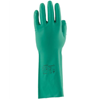 ochranné rukavice CE CAT. III vysoká mechanická odolnost, výborné ochranné vlastnosti nitrilu především pro manipulaci s chemikáliemi, vhodné do olejů pro většinu profesionálních čistících aplikací povrchová úprava pro snadnější a bezpečnější úchop tloušťka dlaně: 0,38 mm +- 0,05 mm délka: 330 +- 10 mm barva: zelená materiál: nitril velikosti: 6-10