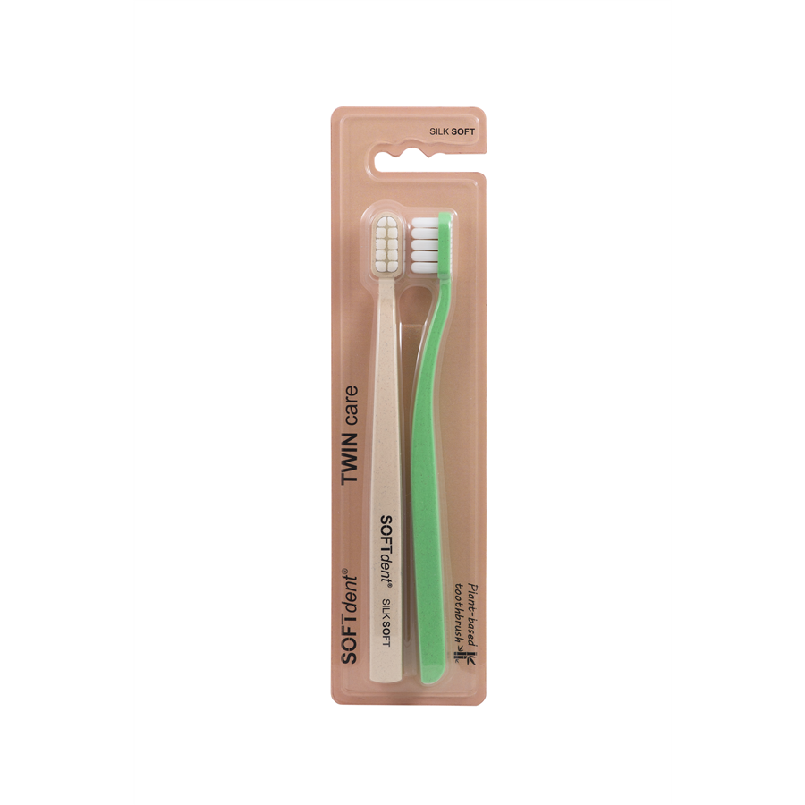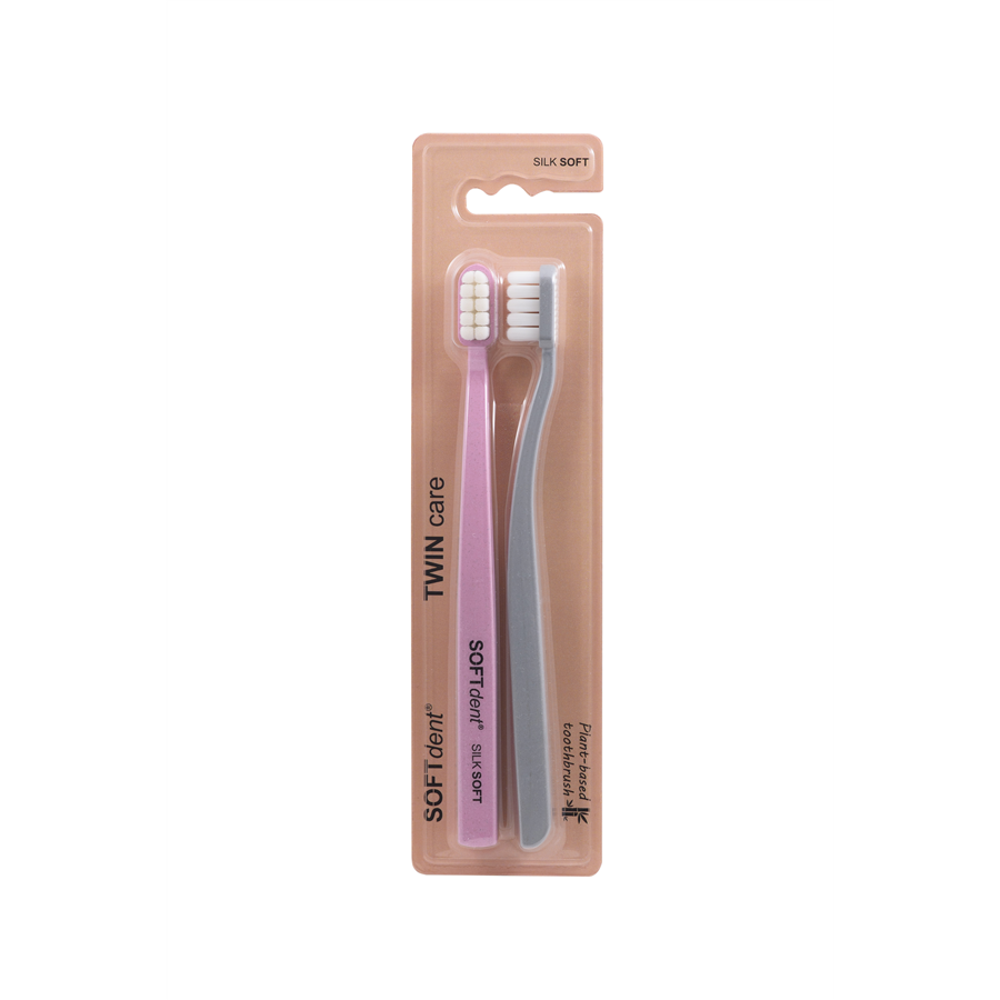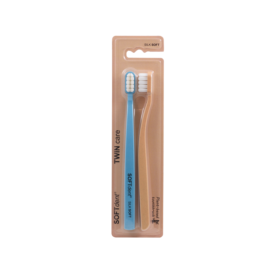 Zubní kartáček SOFTdent® TWIN je určen pro každodenní, mimořádně šetrnu, ale zároveň účinnou péči o zuby a dásně. Kombinuje více než 10 400 ultra jemných NANO vláken, která se snaddno přizpůsobí tvaru zubů, štrně čistí i citlivé oblasti a účinně odstraňují zubní plak bez podráždění. Zadní strana hlavy je vybavena praktickým čističem jazyka pro dokonalou ústní hygienu.