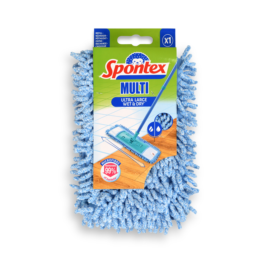 Náhrada na mop Spontex Microwiper Multi. Kvalitní mikrovlákno se speciální strukturou zachycuje veškeré částice špíny a prachu přímo uvnitř vlákna. Účinkuje i bez použití čistících prostředků, stačí čistá voda.