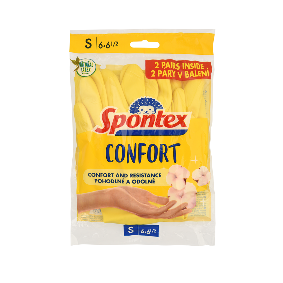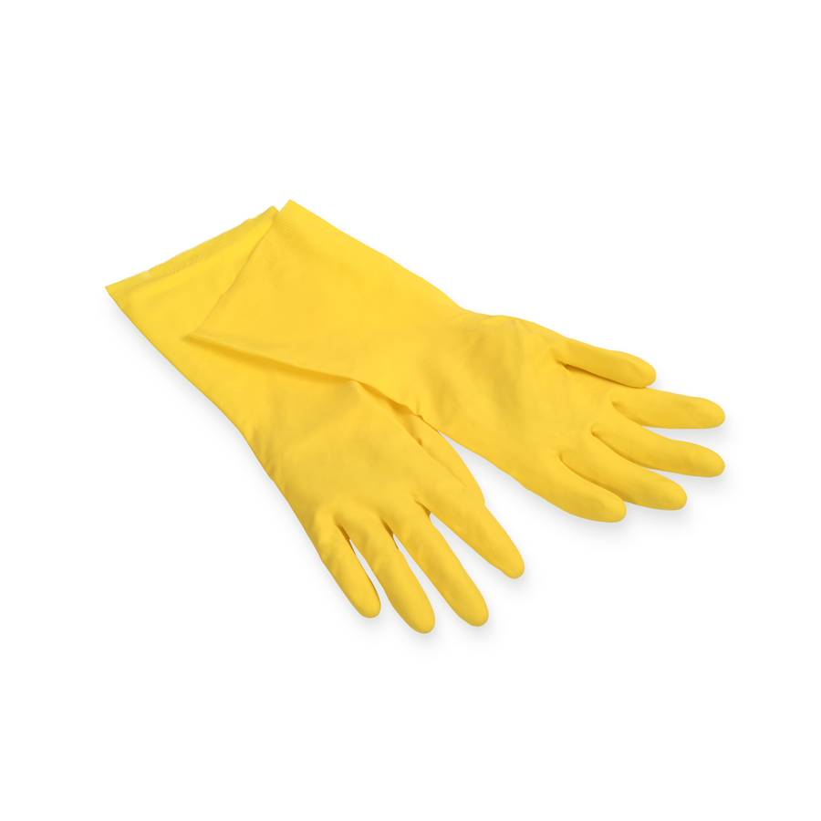 "100% latexové rukavice pro opakované použití s bavlněnou výstelkou pro větší pohodlí (absorbuje pot a udržuje ruce suché). Vysoce elastické. Uzpůsobené pro kontakt s vodou a běžnými čisticími prostředky. Ve žluté barvě. Balení obsahuje 2 páry rukavic. Obsahuje přírodní latex; nedoporučuje se pro lidi s alergií na přírodní latex."