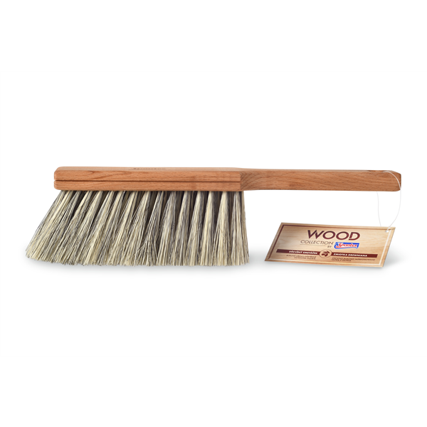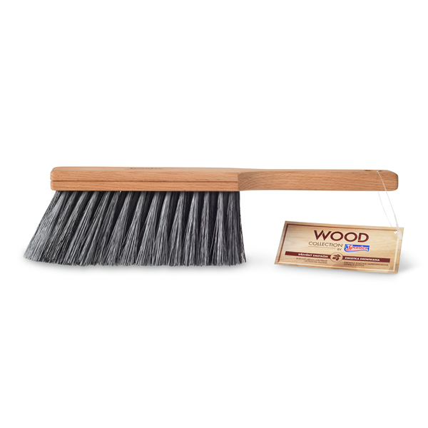 Dřevěný smetáček. Masivní bukové dřevo impregnované olivovým olejem. Přírodní a PET štětiny. Vhodný pro všechny typy povrchů. K dispozici dvě barvy namixované v kartonu (stříbrné a světle hnědé štětiny).