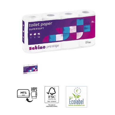 Volba pro vysoké nároky na kvalitu a hygienu: vysoce kvalitní 3-vrstvá celulóza z udržitelného lesního hospodářství se přemění na super měkký, zářivě bílý a savý toaletní papír.