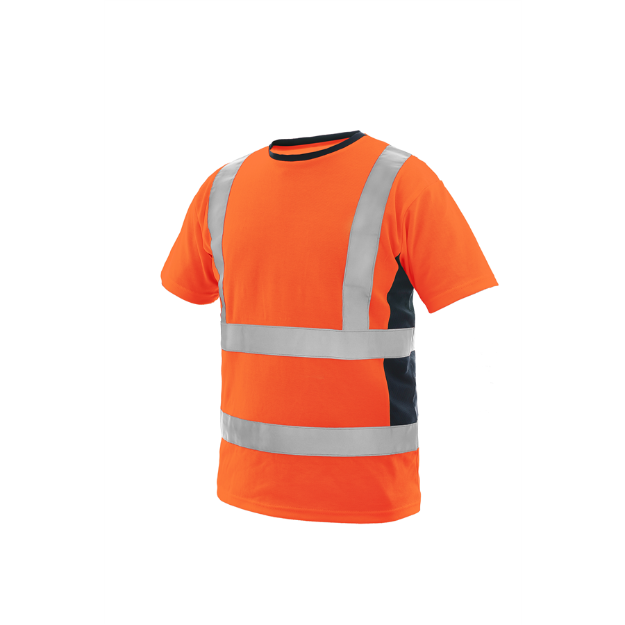 Výstražné tričko s kulatým průkrčníkem v kontrastní modré barvě, krátký rukáv, reflexní pruhy: 2 horizontální, 2 vertikální (šíře 5 cm), po stranách panely ze síťoviny v modré barvě. Doporučené použití: stavebnictví, silničáři, řidiči, logistika, údržba, kolo, motorky, skladování. Tričko, výstražné, kr.rukáv, barva oranžovo-modrá, žluto-modrá, 55% bavlna, 45% polyester, EN 20471