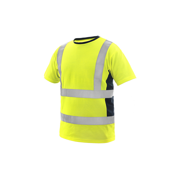 Výstražné tričko s kulatým průkrčníkem v kontrastní modré barvě, krátký rukáv, reflexní pruhy: 2 horizontální, 2 vertikální (šíře 5 cm), po stranách panely ze síťoviny v modré barvě. Doporučené použit...