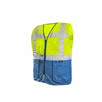 Dvoubarevná výstražná vesta se zapínáním na zip, 2 spodní kapsy kryté patkou, vpravo nahoře kapsa na mobil a tužku, kroužek na přichycení ID karty, vlevo nahoře průhledná kapsička na ID kartu, reflexní pásky kolem těla i přes ramena. Moderní a víceučelový design zajišťuje bezpečnost, pohodlí i praktičnost. Spodní modrá část vesty chrání vestu, aby bylo znečištění méně viditelné. Výstražná dvoubarevná vesta, barva žluto-modrá, vel. S-3XL, EN 20471