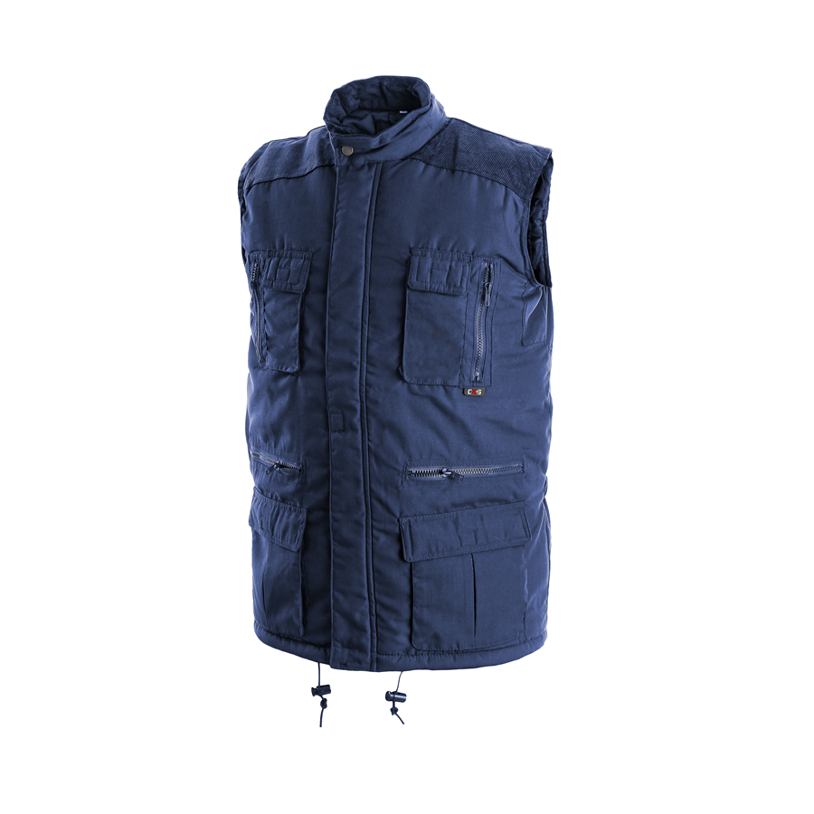 Zateplená vesta, ramena a límec pošitý manšestrem, pružné stažení průramku, možnost stažení vesty v pase, 14 kapes - z toho 3 kapsy uvnitř vesty. Vesta zateplená, ramena a límec prošitý manšestrem, materiál bavlna -polyester, modrá, vel.M-3XL
