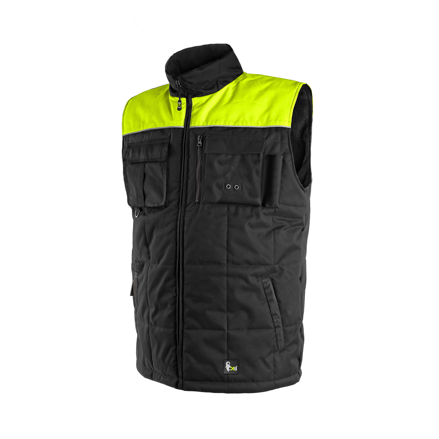 Zateplená vesta, voděodolná, s fleecovou podšívkou, reflexní výpustky, stahování v dolním okraji, voděodolnost 2 000 mm. Vesta zateplená s fleecovou podšívkou, barva černo-žlutá, vel.M-3XL
