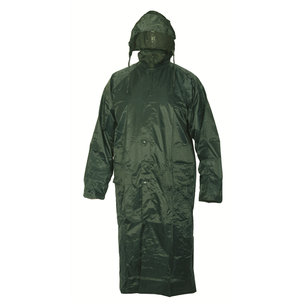 Voděodolný plášť, kapuce v límci, délka 120 cm, nižší hmotnost, v praktickém balení. Pogumovaný plášť- dlouhý s kapucí, délka 130 cm, odolnější materiál nylon, nižší hmotnost, barva zelená, vel.M-4XL.